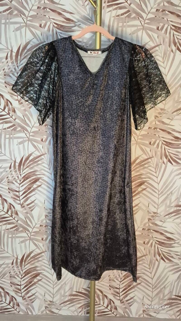 Feestelijk jurkje in stretchfluweel met kanten statement-mouwen en een bescheiden V-hals. In donkerpaars met zwarte luipaardprint.
