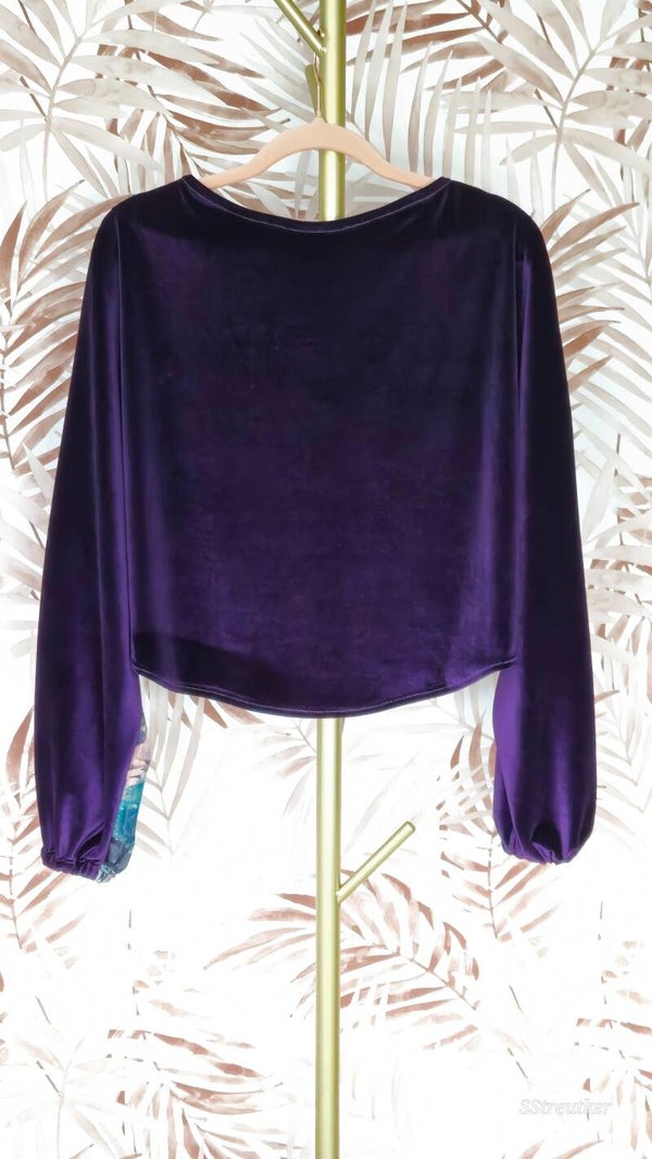 Heerlijk zachte boho-style overslagtop, in paarse en gebloemde stretch velours.