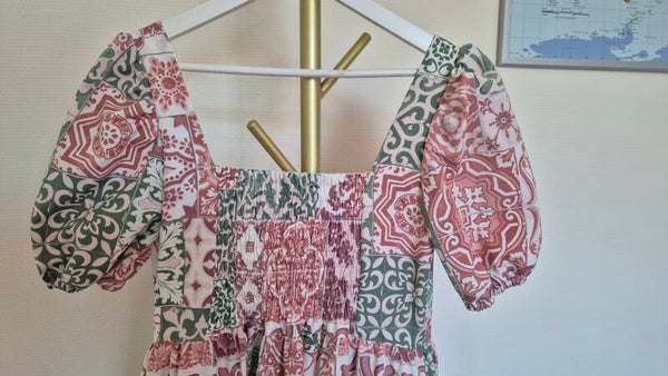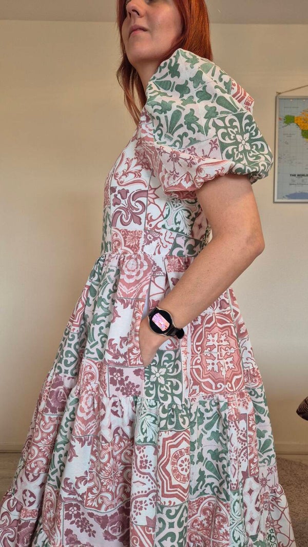 Prachtige jurk met een 3-laags strokenrok en pofmouwen. Met een rechte halslijn, elastisch paneel op de rug en .... IT HAS POCKETS!