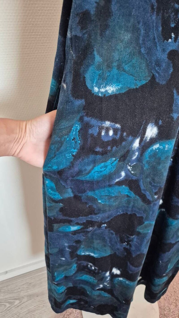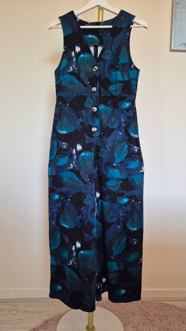 Prachtige, comfortabele jumpsuit van stretchkatoen. Recht model, culotte lengte met wijde pijpen. en... IT HAS POCKETS! De intense blauw/groene kleuren in de print maken dit echt een statement piece!